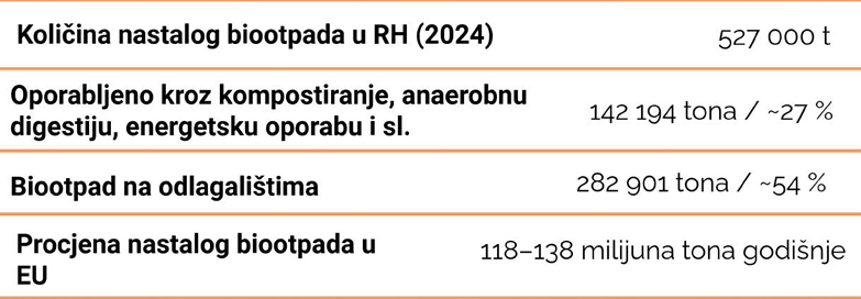 Biootpad čini najveći udio komunalnog otpada, a istodobno predstavlja jedan od najvećih izazova u sustavu gospodarenja otpadom. Prema najnovijim dostupnim podacima, u Republici Hrvatskoj je tijekom 2024. godine nastalo oko 527.000 tona biootpada, od čega je svega oko 27 % oporabljeno, dok je više od 50 % završilo na odlagalištima. Slični izazovi prisutni su i na razini Europske unije, gdje se godišnje generira između 118 i 138 milijuna tona biootpada.